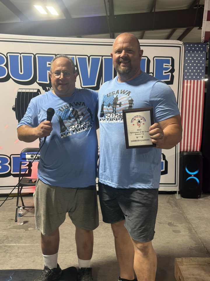 The 2025 USAWA Sportsman of the Year Runner up is Jarrod Gaddis from Buffville Gym. The ‘short and tall’ of his story (see picture below) would reveal he is cut from similar cloth to our Sportsman of the Year winner.  He is an accomplished lifter in his own right with the second largest Hackenschmidt Floor Press in the record books at 440 lbs. He was also the 2024 Kentucky Open Men’s Champion. He is always willing to help out as a referee and has a good eye for judging lifts. Jarrod Gaddis is a valued member of the Buffville team and is always helping out when there’s a meet, and you can always find him spotting on the competition platform or at the warm-up platform, or encouraging other lifters. He is outgoing and very polite and makes visiting lifters feel very welcome. Congratulations to the USAWA Sportsman Runner-up, Jarrod Gaddis!
